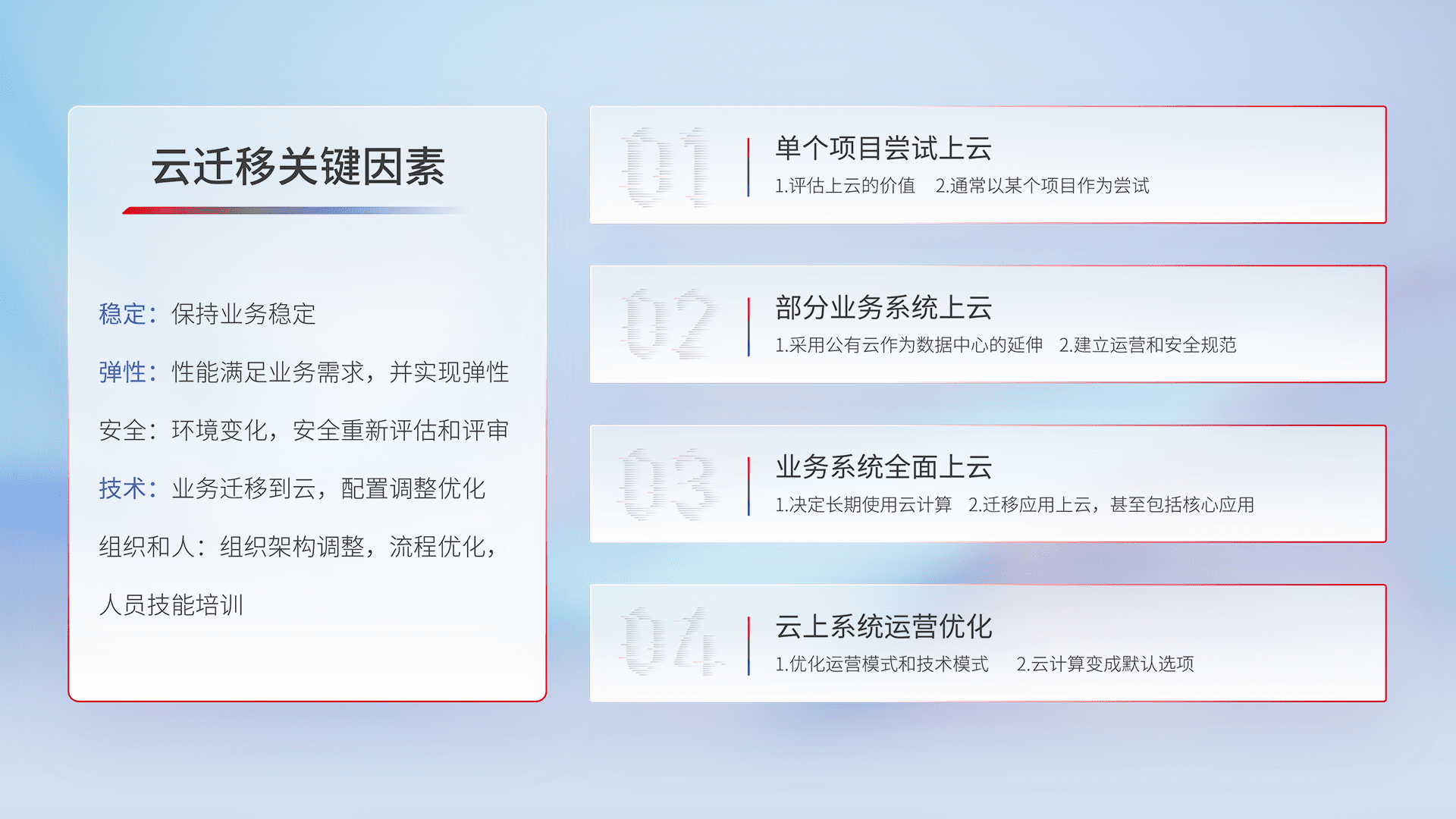 结合实际业务,,,,从规划设计、、云平台选型、、、、云原生改造、、数据迁移、、集成交付,,,,迁移全过程为客户识别最佳上云路径,,做好风险识别管理,,,设计网络架构、、、、身份权限、、、、安全审计合规、、、操作审计、、日志审计、、监控告警策略、、、多站点容灾设计等,,,对云上基础设施进行整体规划,,,提升IT治理水平,,,以满足弹性、、、、高可用、、、高性能的需求。。。。