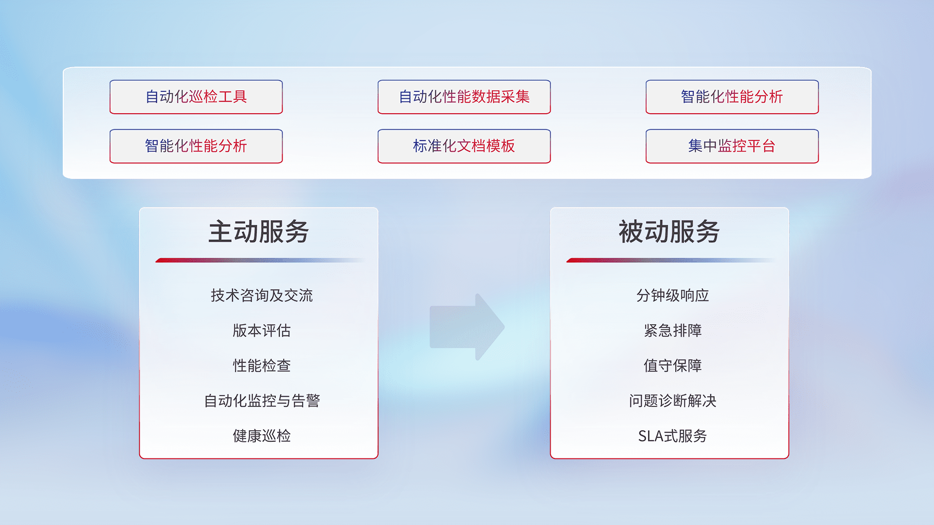 智能化工具和标准化文档,,,,保障服务质量,,,提供主动服务(包含技术咨询、、、版本评估、、、、性能检查、、自动化监控与告警、、健康巡检)和被动服务包含(分钟级响应、、紧急排障、、值守保障、、、问题诊断解决、、SLA服务)。。
